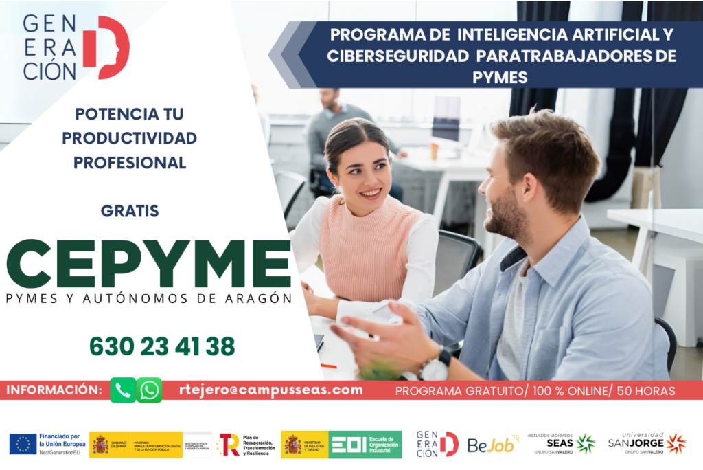 Por ello, desde Grupo San Valero, en colaboración con CEPYME Aragón, presentamos esta formación en Inteligencia Artificial. Se trata de un programa 100% gratuito, financiado por la Unión Europea (Next Generation EU) y gestionado por el Ministerio para la Transformación Digital y la Función Pública, a través de la Escuela de Organización Industrial (EOI)