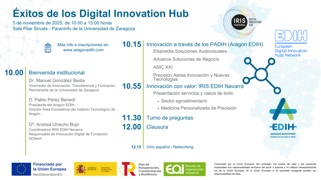 Con el objetivo de compartir experiencias y resultados, el próximo 5 de noviembre se celebrará en el Paraninfo de la Universidad de Zaragoza, de 10:00 a 12:15 horas, el encuentro “Casos de Éxito de los EDIH de Aragón y Navarra”, un evento que reunirá a responsables institucionales, investigadores y empresas que lideran proyectos de innovación tecnológica en la región.