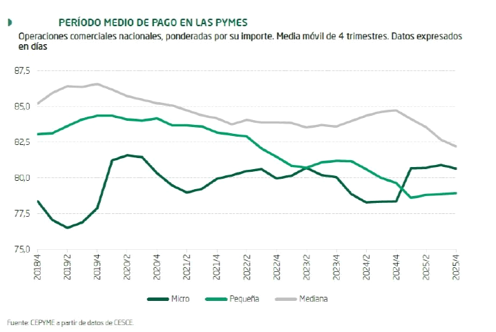 El periodo medio de pago (PMP) se situó en 80,5 días en promedio en 2025, 0,6 días menos que el año anterior, pero aún un 34% por encima del plazo máximo legal, establecido en 60 días, según los datos del Observatorio de Morosidad de CEPYME, correspondiente al segundo semestre de 2025, que la Confederación elabora con datos de Informa D&B y CESCE.