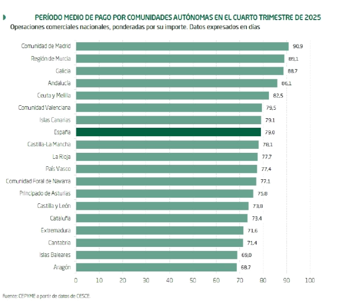 Por sectores, el PMP se incrementó en el cuarto trimestre de 2025 tanto en la construcción (96,5 días, frente a 90,4 en el mismo período de 2024) como en el sector agroalimentario (74,4 días, frente a 73 en el cuarto trimestre de 2024). Por el contrario, en términos interanuales, los servicios y la industria redujeron su PMP, especialmente en el primer caso ya que ha descendido en 3,1 días hasta situarse en 70,6 días. En cuanto a la industria, la caída fue de 1,7 días hasta alcanzar los 74,3 días.. La Comunidad de Madrid fue la comunidad con el PMP más elevado (90,9 días), por delante de Murcia y Galicia (89,1 días y 88,7 días, respectivamente). En el lado opuesto, las Islas Baleares y Aragón fueron las comunidades autónomas con un PMP más reducido (69 días y 68,7 días, respectivamente).