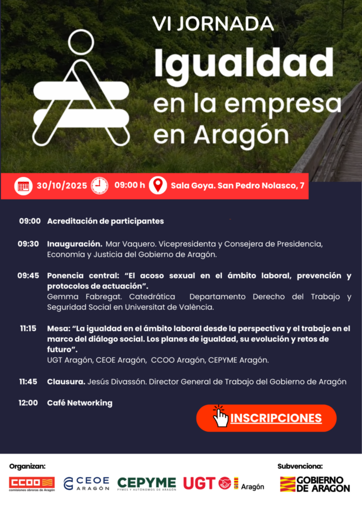 El próximo 30 de octubre de 2025, la Sala Goya (San Pedro Nolasco, 7, Zaragoza) acogerá la VI Jornada “Igualdad en la Empresa en Aragón”, un encuentro de referencia en materia de igualdad de oportunidades en el ámbito laboral aragonés.