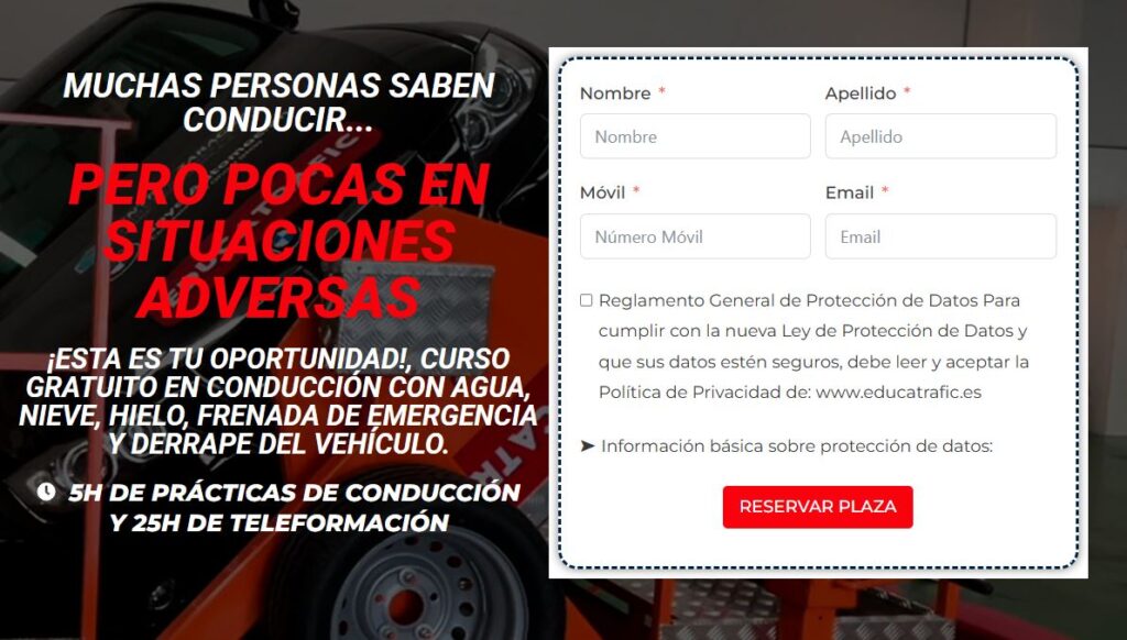 La formación tiene 25 horas on line y 5 horas presenciales en la escuela de conducción Educatrafic, siendo fundamental estas horas prácticas, porque la conducción es practicar y coger hábitos en nuestra conducción. En este tiempo practicaremos frenadas de emergencia con ABS y sin ABS, frenadas con esquiva y corrección de subvirajes y sobrevirajes.