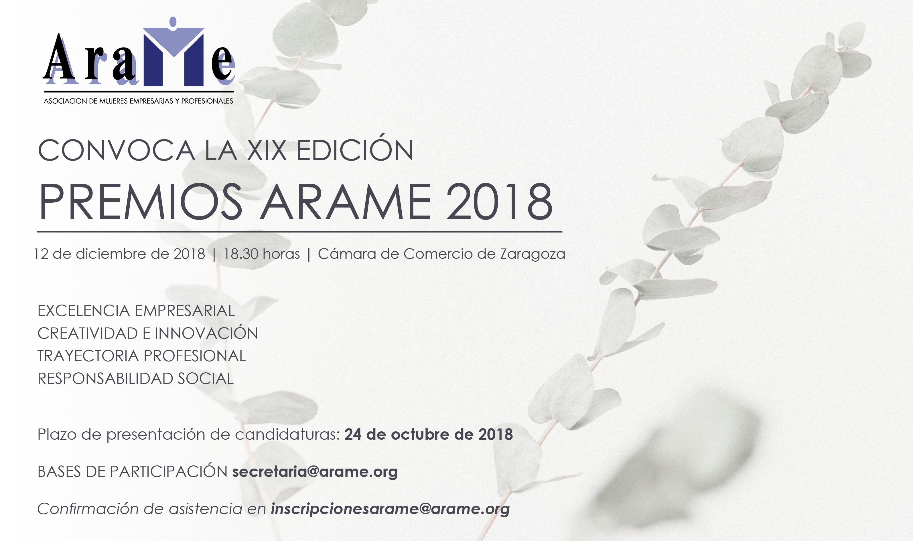ARAME, Asociación Aragonesa de Mujeres Empresarias, Profesionales, Directivas y/o Gerentes, convoca la XIX Edición de los Premios ARAME. Con estos galardones quieren resaltar y poner en valor el buen hacer y la profesionalidad de las empresarias, profesionales, directivas y/o gerentes de nuestra Comunidad Autónoma, la pasión por lo que hacen, el esfuerzo y tesón por hacerlo bien, de manera excelente y su compromiso constante de mejora continua.
