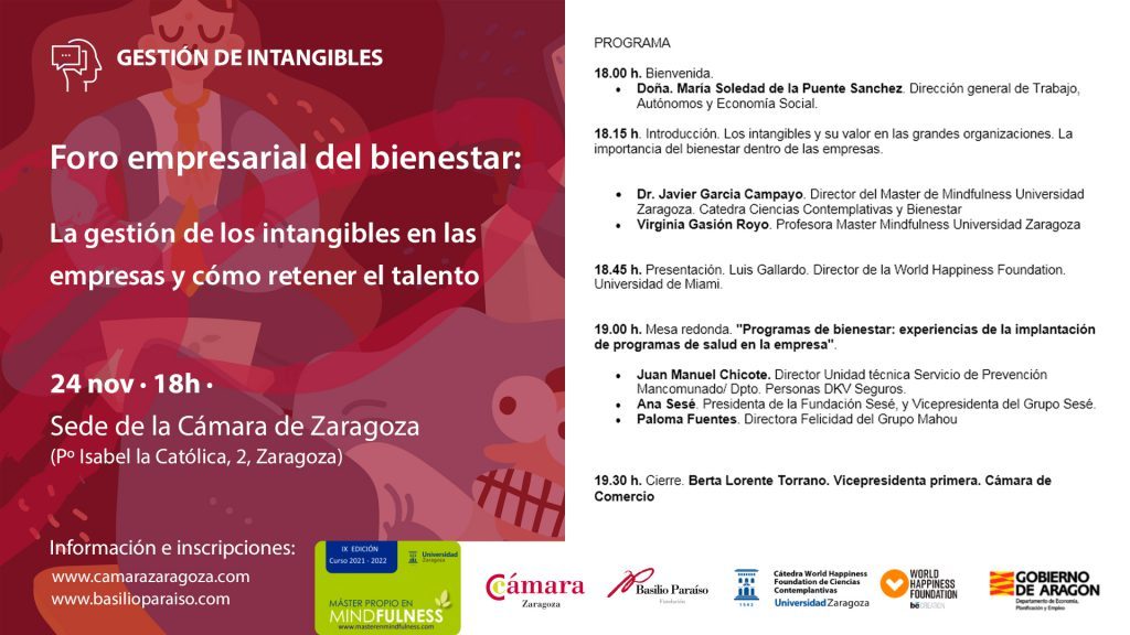 Cámara Zaragoza organiza el próximo 24 de noviembre de 18h a 20h el Foro Empresarial del Bienestar: la gestión de los intangibles en las empresas y cómo retener el talento.