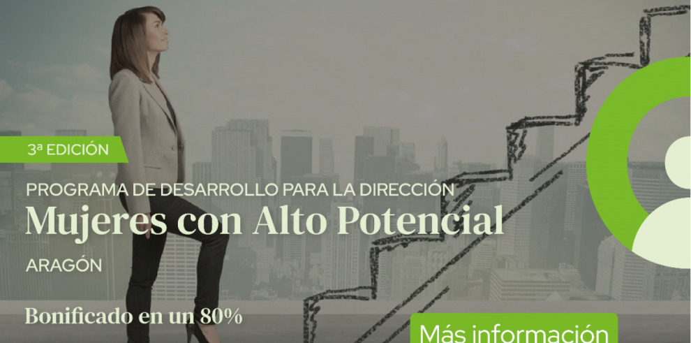 El próximo 17 de mayo comenzará la III edición del Programa de Desarrollo para la Dirección – Mujeres con Alto Potencial, organizado por el departamento de Economía, Planificación y Empleo y la Escuela de Organización Industrial (EOI). Este programa formativo semi-presencial, para el que ya está abierto el plazo de selección, está dirigido a mujeres profesionales residentes en Aragón que desempeñen funciones directivas o predirectivas en empresas locales. Como en las ediciones anteriores, esta formación especializada estará bonificada al 80% por el Gobierno de Aragón para sus 22 participantes.