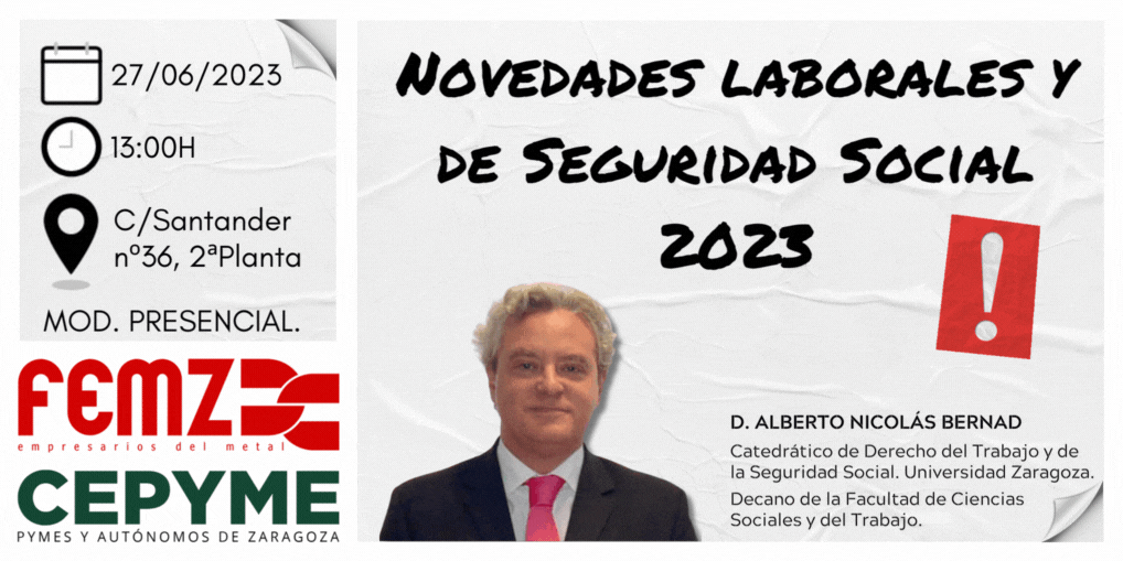 Será el próximo martes 27 de junio, en la sede de FEMZ, cuando el Dr. Alberto Nicolás Bernad, Catedrático de Derecho del Trabajo y de la Seguridad Social de la Universidad de Zaragoza y Decano de la Facultad de Ciencias Sociales y del Trabajo, realice con nosotros una aproximación práctica y crítica a las novedades laborales y de seguridad social de 2023.
