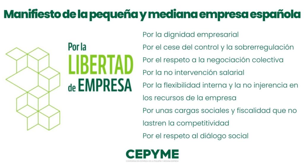 El Manifiesto de la pyme española por la libertad de empresa recoge las líneas que, en opinión de la empresa, el Gobierno no debería transigir con el fin de no interferir en el buen funcionamiento de la actividad empresarial, evitando su coerción y estableciendo obstáculos a su desarrollo. En definitiva, defender la libertad de empresa, cesar el intervencionismo y la estigmatización de la figura del empresario. CEPYME defiende la obtención de beneficios por parte de las empresas. Un texto, como ha explicado el presidente de CEPYME, “en el que defendemos la dignidad y la libertad empresarial; en el que denunciamos la situación a la que se nos aboca desde el Gobierno a las pymes españolas; en el que señalamos aquellos ámbitos en los que se nos ataca reiteradamente: desde el diálogo social y la negociación colectiva, hasta la sobrerregulación o los intentos de control de la empresa, pasando por la intervención salarial, los costes sociales o la fiscalidad. En el que pedimos que esa actitud sea corregida.”