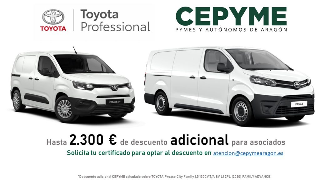 TOYOTA España ofrece a los asociados de CEPYME Aragón descuentos de hasta un 38% sobre el Precio Franco Fábrica (PFF) en sus concesionarios oficiales de Aragón.