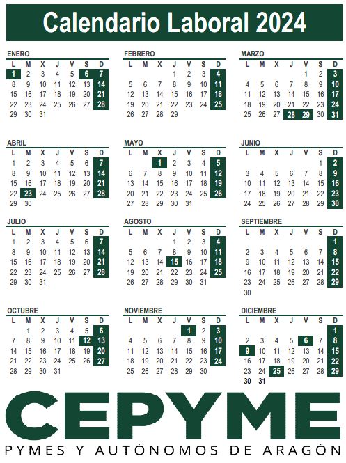 CEPYME Aragón pone a disposición de los asociados el Calendario Laboral correspondiente al año 2024 en formato PDF.