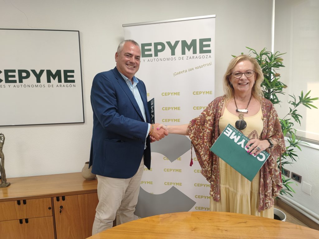 María Jesús Lorente, presidenta de CEPYME Zaragoza, acompañada de Eduardo Colell, director de Fundación Educatrafic han sellado las rubricas del documento que, a través de varias acciones trasversales, busca la prevención de los accidentes laborales, así como la difusión de la importancia de la seguridad vial para reducir la siniestralidad en las carreteras aragonesas.