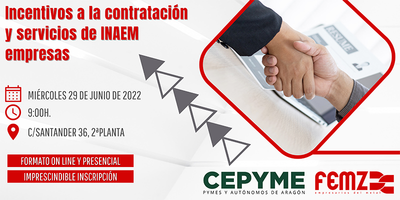 CEPYME Aragón y la Federación de Empresarios del Metal de Zaragoza (FEMZ), con la colaboración de INAEM, organizan el próximo miércoles 29 de junio a las 9 horas una jornada sobre los incentivos a la contratación.
