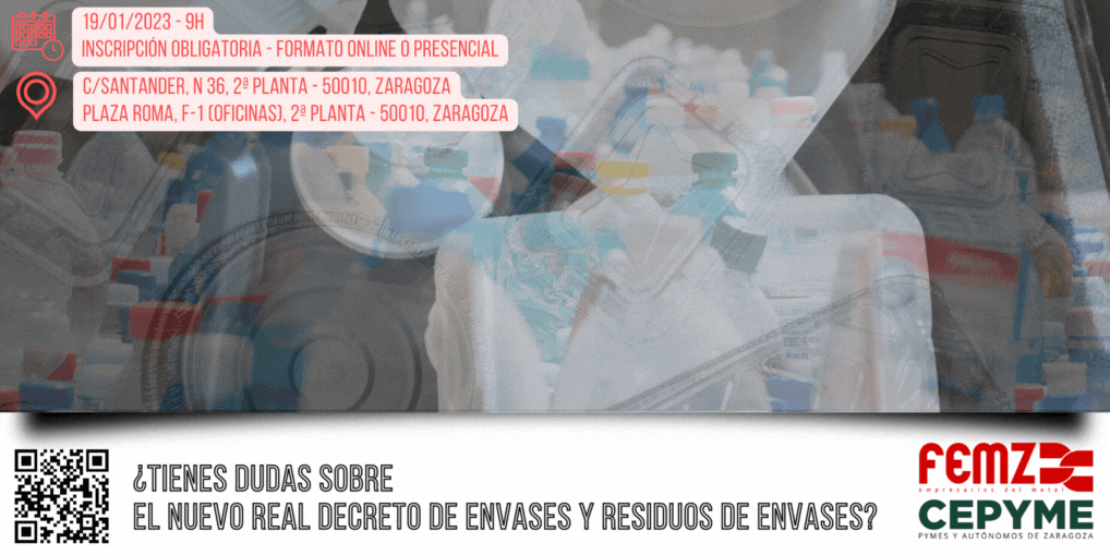 Dada la importancia de la norma aprobada y las afecciones que pueden suponer para nuestras empresas, CEPYME Zaragoza y la Federación de Empresarios del Metal de Zaragoza han organizado un seminario informativo en formato mixto (on-line o presencial) el jueves 19 de enero a las 9 h para intentar resolver las dudas que puedan surgir en la aplicación del citado Real Decreto 1055/2022, de 27 de diciembre de 2022.