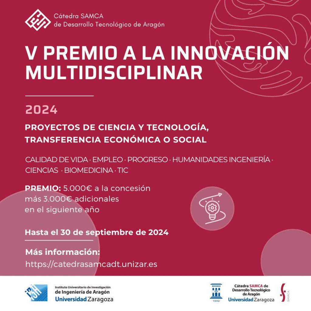 La Cátedra SAMCA de Desarrollo Tecnológico de la Universidad de Zaragoza convoca la quinta edición del Premio a la Innovación Multidisciplinar con el que quiere reconocer aquellos proyectos en los que se unan diferentes ámbitos de trabajo y contribuyan al progreso, a través de la transferencia a la sociedad. Es una iniciativa que fomenta la colaboración entre diferentes áreas de conocimiento como las Humanidades, Sociales, Ingeniería, Ciencias Biomédicas y Tecnologías de la Información y la Comunicación (TIC). El premio está dotado con 5.000 euros, además de una aportación adicional de 3.000 euros, al año siguiente, tras el seguimiento del proyecto.