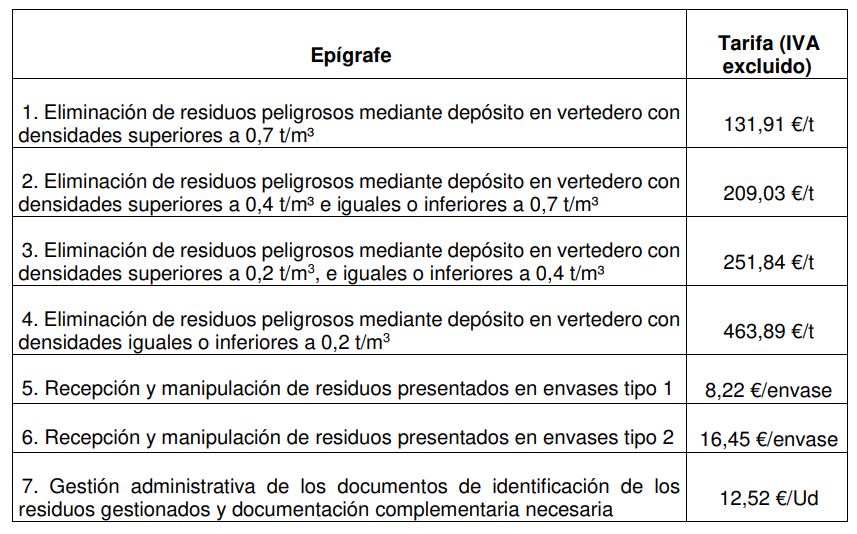 Se publica la actualización de las tarifas que deberán satisfacer las personas usuarias del servicio público aragonés de eliminación de residuos peligrosos mediante depósito en vertedero por la prestación del servicio.