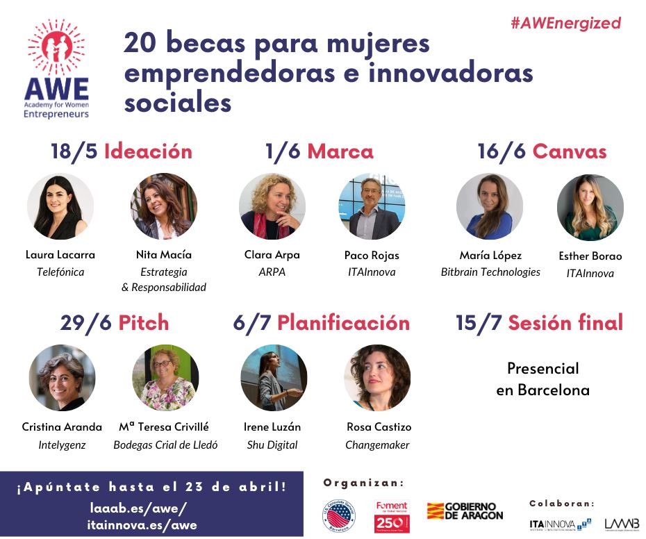 El 5 de mayo se celebrará la apertura del curso y el 15 de julio se celebrará la clausura del programa en Barcelona, en una jornada donde se invitará a las participantes y los facilitadores. Al término del programa se otorgarán seis premios a los proyectos empresariales más destacados y todas las participantes pasarán a formar parte de una gran red global de emprendedoras AWE. En Aragón, además, los tres proyectos más destacados recibirán sendos paquetes de impulso digital por parte del ITAINNOVA, valorados en 1.000 euros cada uno, y un paquete de vídeo para la promoción del proyecto valorado en 1.000 euros por parte del LAAAB.