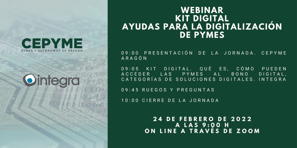 En este webinar organizado conjuntamente por CEPYME Aragón e Integra conoceremos esta iniciativa y cómo las pymes pueden beneficiarse de hasta 12.000 euros del programa para su digitalización.