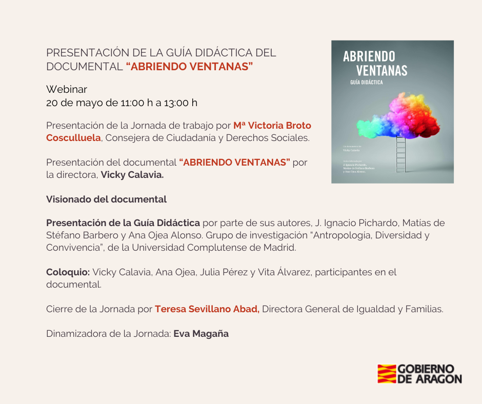 La Dirección General de Igualdad y Familias, del Departamento de Ciudadanía y Derechos Sociales, organiza un webinar con la presentación de la Guía Didáctica ABRIENDO VENTANAS, elaborada por J. Ignacio Pichardo, Matías de Stéfano Barbero y Ana Ojea Alonso del Grupo de investigación “Antropología, Diversidad y Convivencia”, de la Universidad Complutense de Madrid, que complementa el documental del mismo título dirigido por Vicky Calavia y que constituye una excelente herramienta educativa para trabajar la diversidad afectivo sexual en el aula.