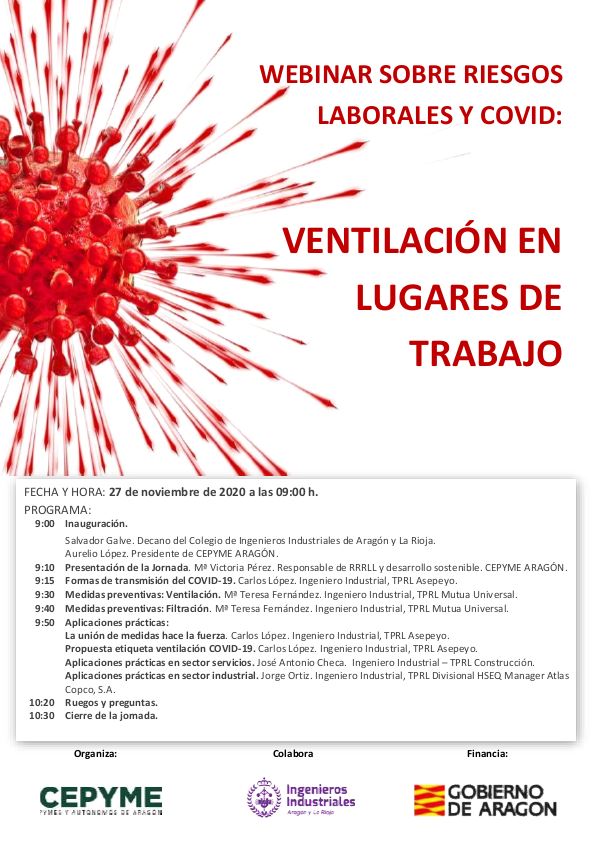 Por eso CEPYME ARAGÓN con la financiación del Gobierno de Aragón en el marco de las subvenciones para la financiación de gastos derivados en el ámbito de las relaciones laborales en materia de prevención de riesgos laborales, igualdad y negociación colectiva durante el año 2020 y con la colaboración del Colegio de Ingenieros Industriales de Aragón y La Rioja, organiza un webinar el próximo 27 de noviembre a las 9 horas.